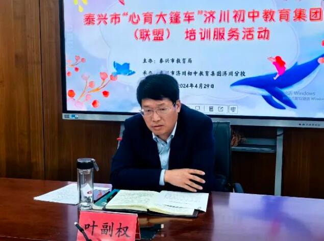 近日,泰兴市“心育大篷车”走进济川初中教育集团(联盟)开展培训服务活动。市教育局副局长叶副权出席。市教育局德育科相关人员,“心育大篷车”工作组成员,济川初中教育集团(联盟)分管负责人、心理教师、班主任代表参加。